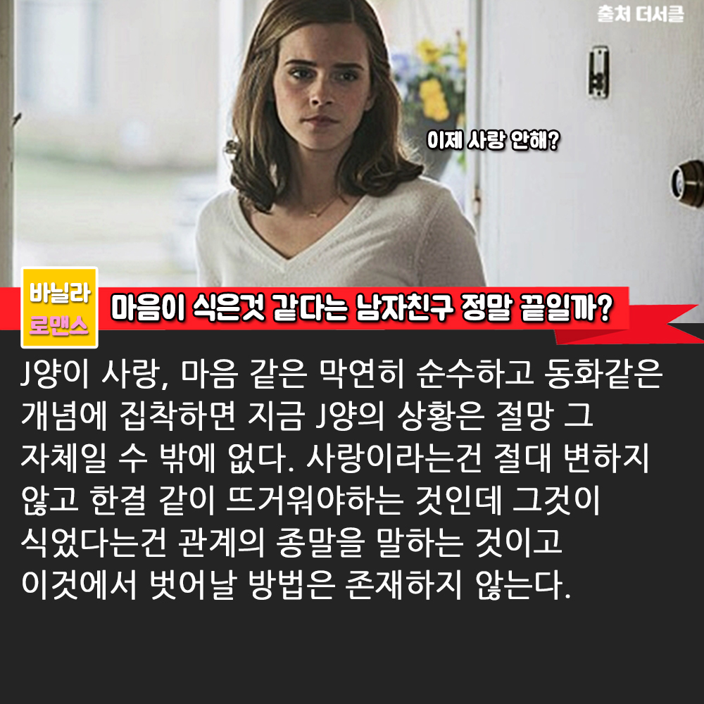 J양이 사랑, 마음 같은 막연히 순수하고 동화같은 개념에 집착하면 지금 J양의 상황은 절망 그 자체일 수 밖에 없다. 사랑이라는건 절대 변하지 않고 한결 같이 뜨거워야하는 것인데 그것이 식었다는건 관계의 종말을 말하는 것이고 이것에서 벗어날 방법은 존재하지 않는다.